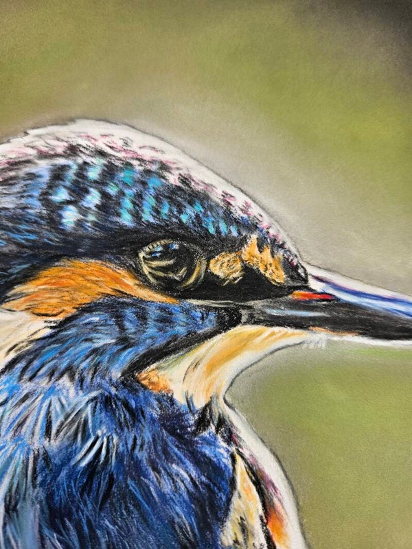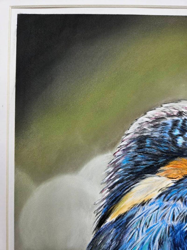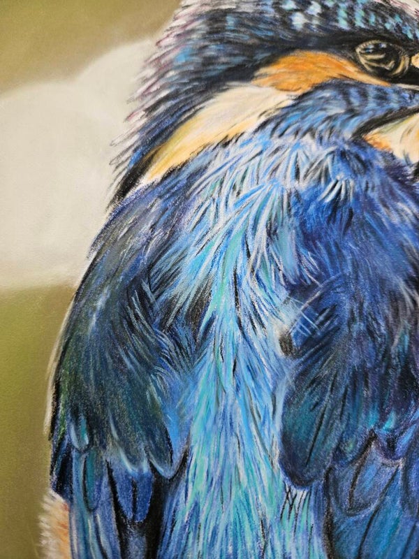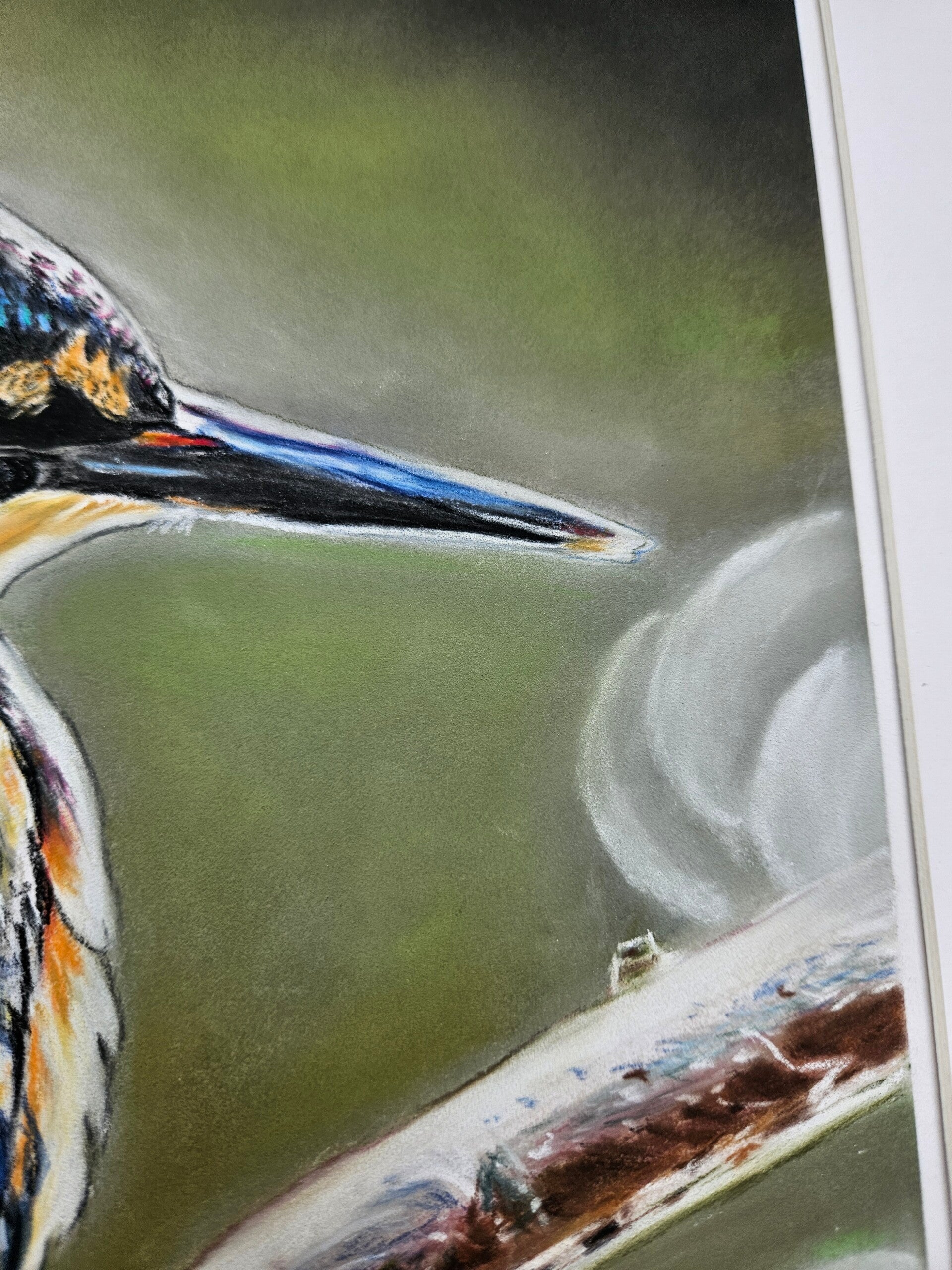 Martin-pêcheur, pastel sec sur papier Pastelmat, réalisé avec des crayons pastel sec et des bâtonnets de pastel tendre Faber-Castell, Conté à Paris et Derwent.
