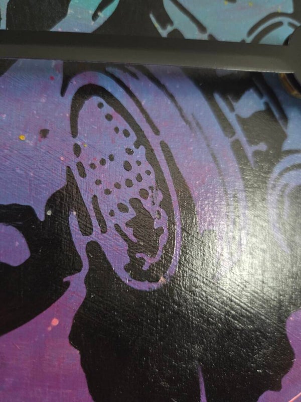Inspirée par l'univers du graffiti et du street art, elle présente un design audacieux et coloré. Le fond arbore des teintes de bleu et de violet avec des motifs rappelant un mur de briques et des tags stylisés. Au centre, une silhouette intrigante portant un masque à gaz capte le regard, ajoutant une dimension urbaine et contemporaine. Des éclaboussures de peinture et des formes abstraites viennent dynamiser l'ensemble.