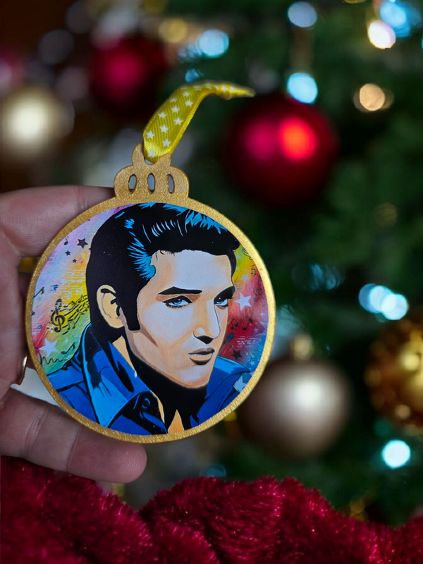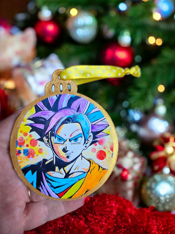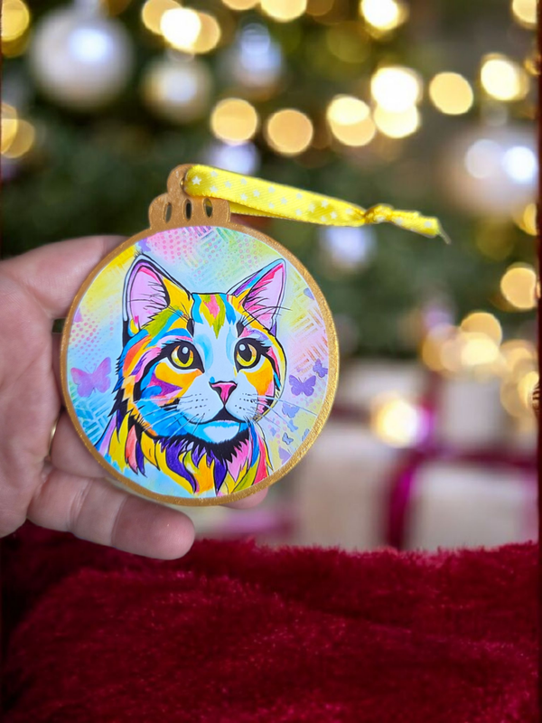 Boule de Noël faite à la main sur boule en bois plate avec des mini-reproductions de mes œuvres pop art, sur papier photo.