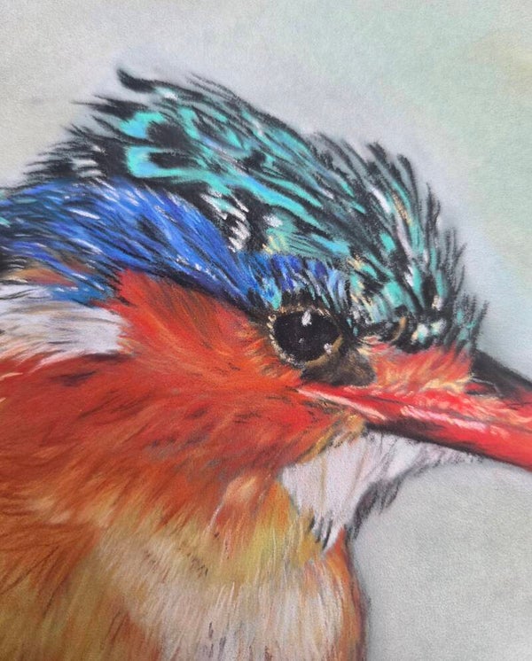 J'ai cherché à mettre en valeur l'éclat hypnotique de son plumage turquoise et orange-roux grâce à la richesse et à la profondeur du pastel. Le fond doux et atmosphérique a été travaillé pour faire ressortir l'intensité de ses couleurs.