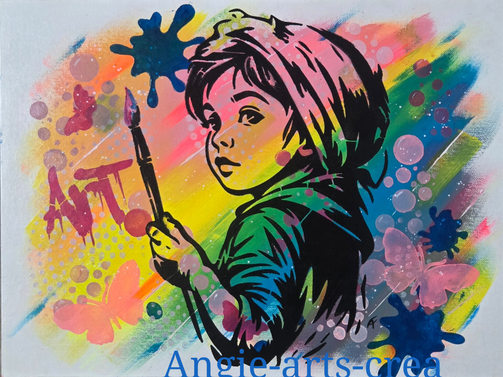 "Découvrez cette œuvre vibrante et pleine d'espoir intitulée 'L'enfant intérieur'. Réalisée sur toile cartonnée (30x40 cm), cette pièce unique marie la précision du pochoir et l'énergie de l'acrylique.