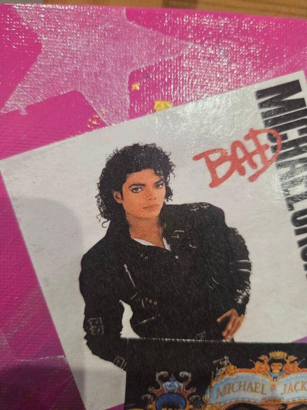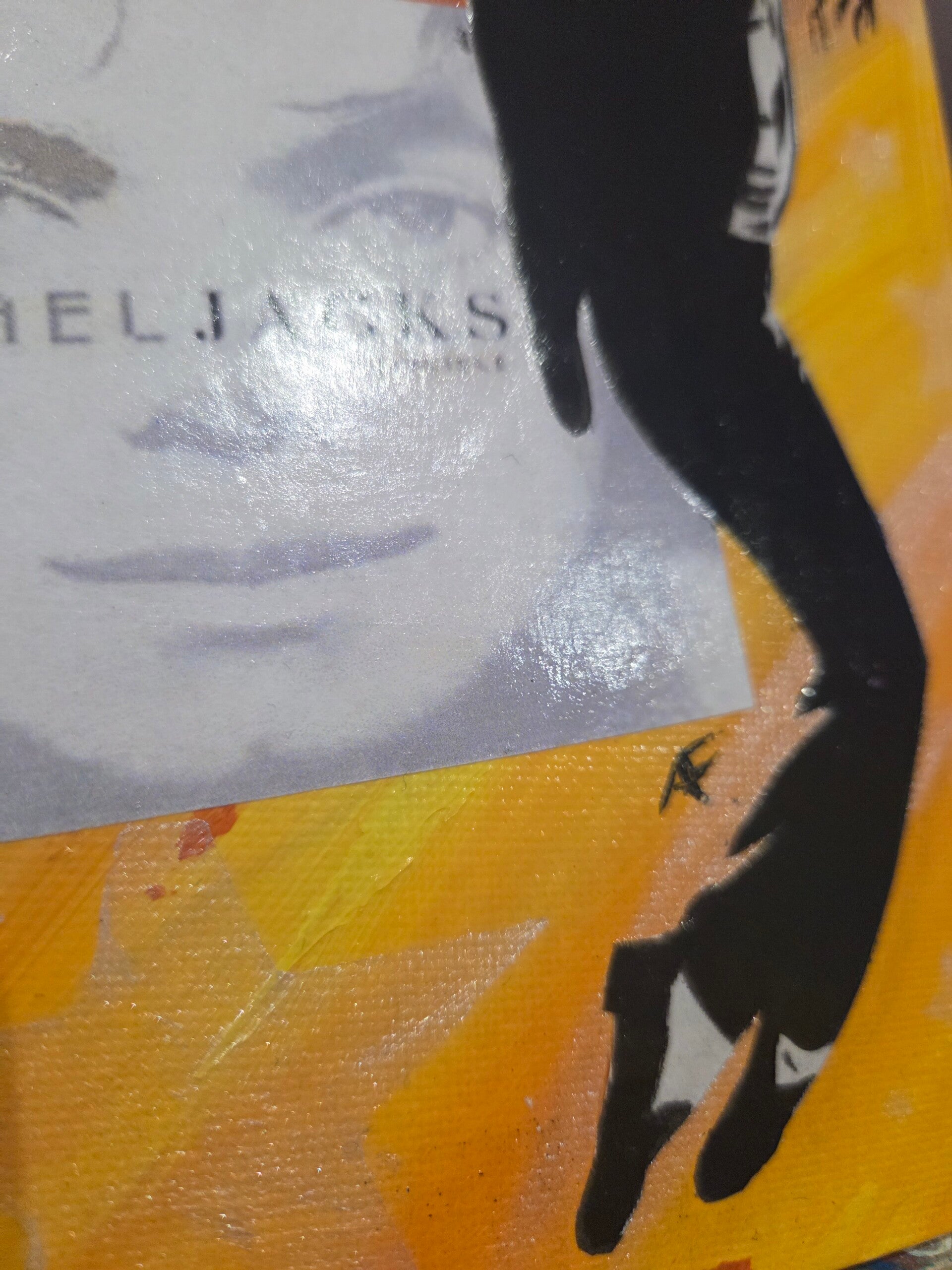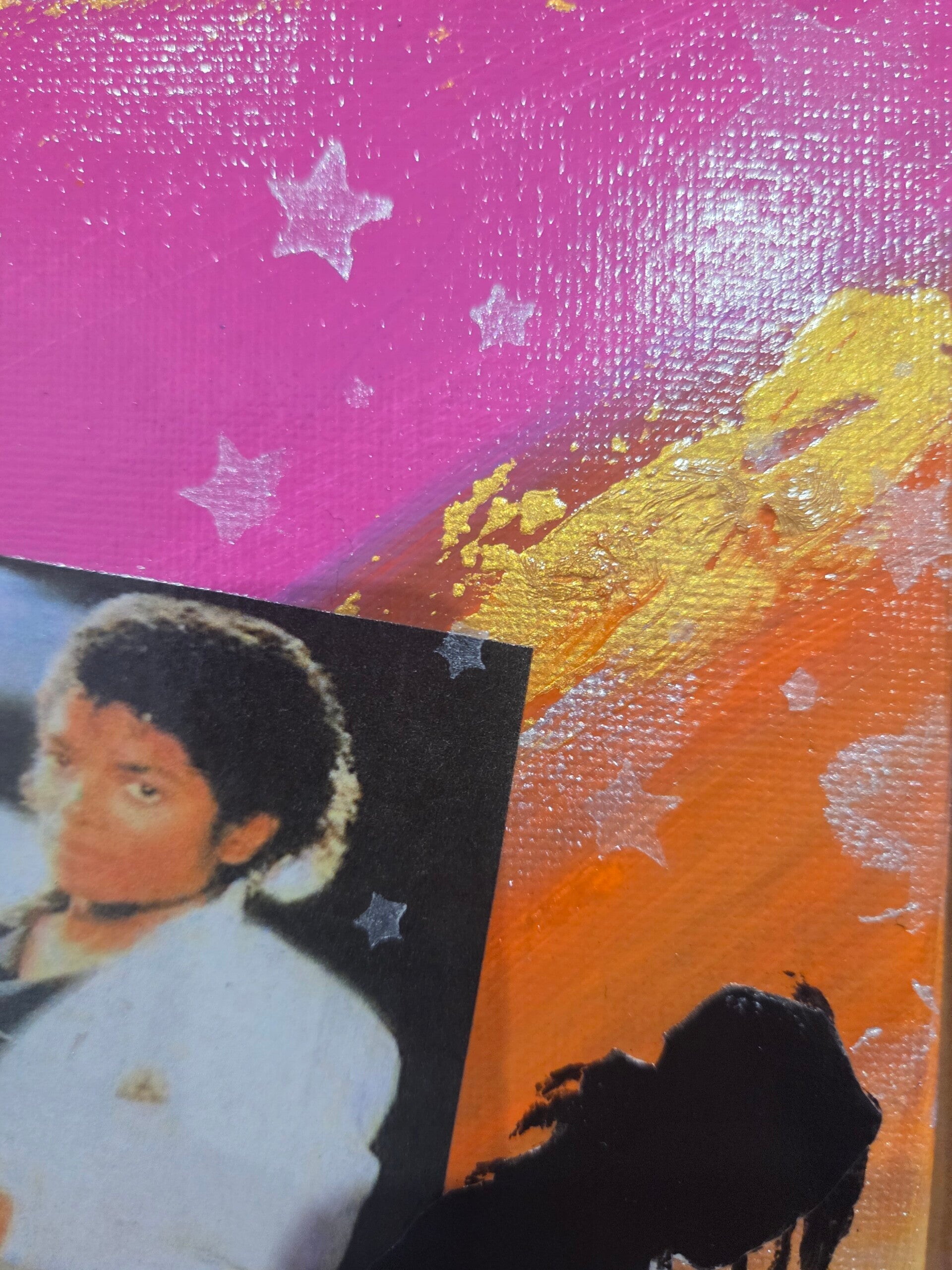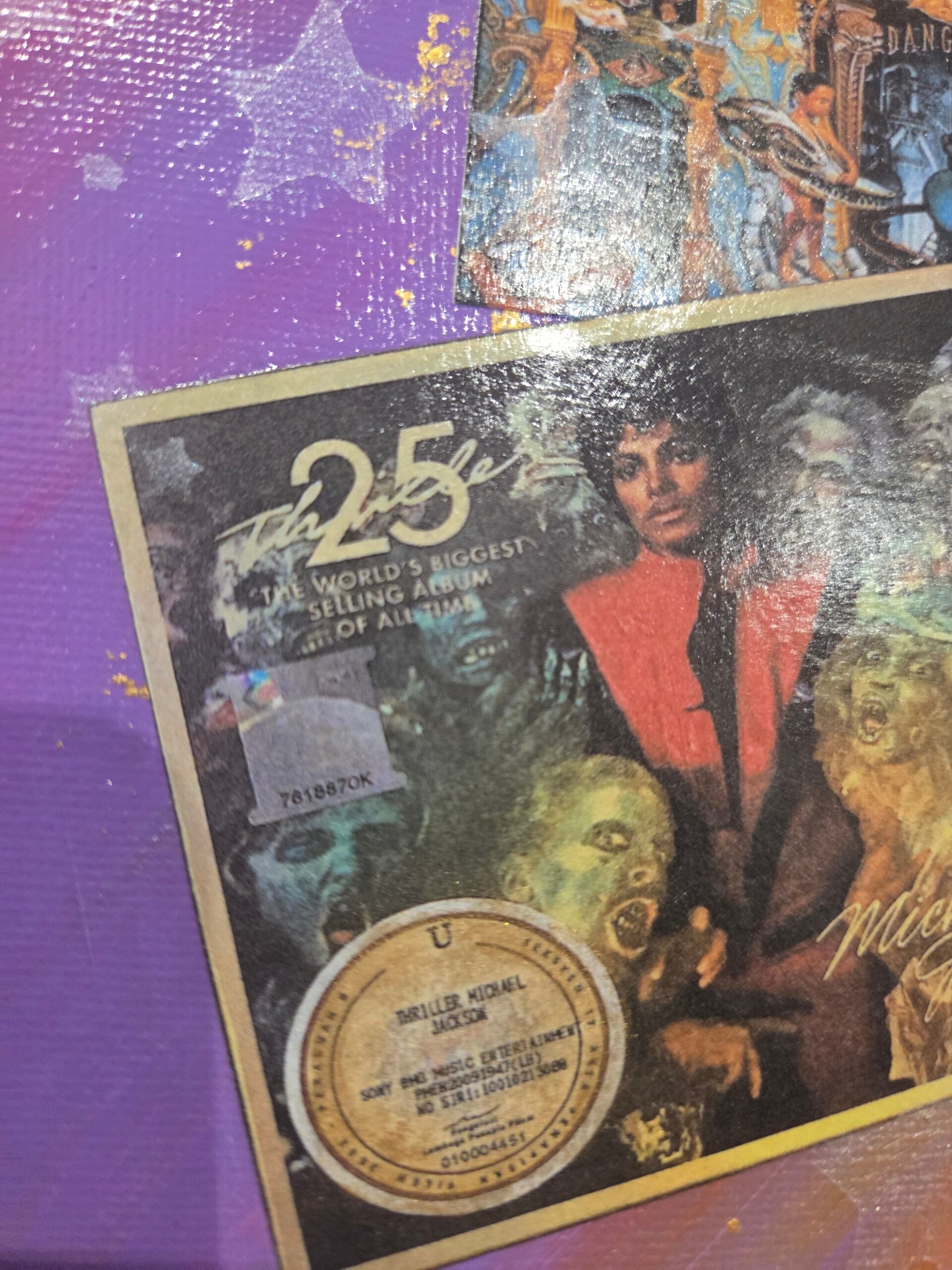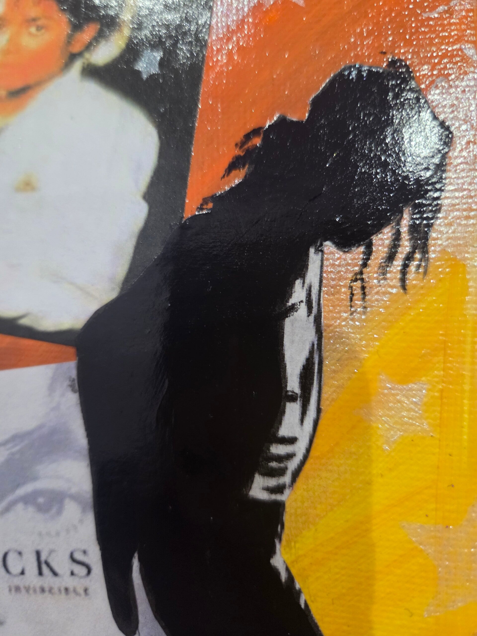 Technique : Mixte / Collage. On y retrouve les pochettes mythiques des albums Bad, Thriller, Dangerous, Invincible ainsi que l'édition spéciale des 25 ans de Thriller.