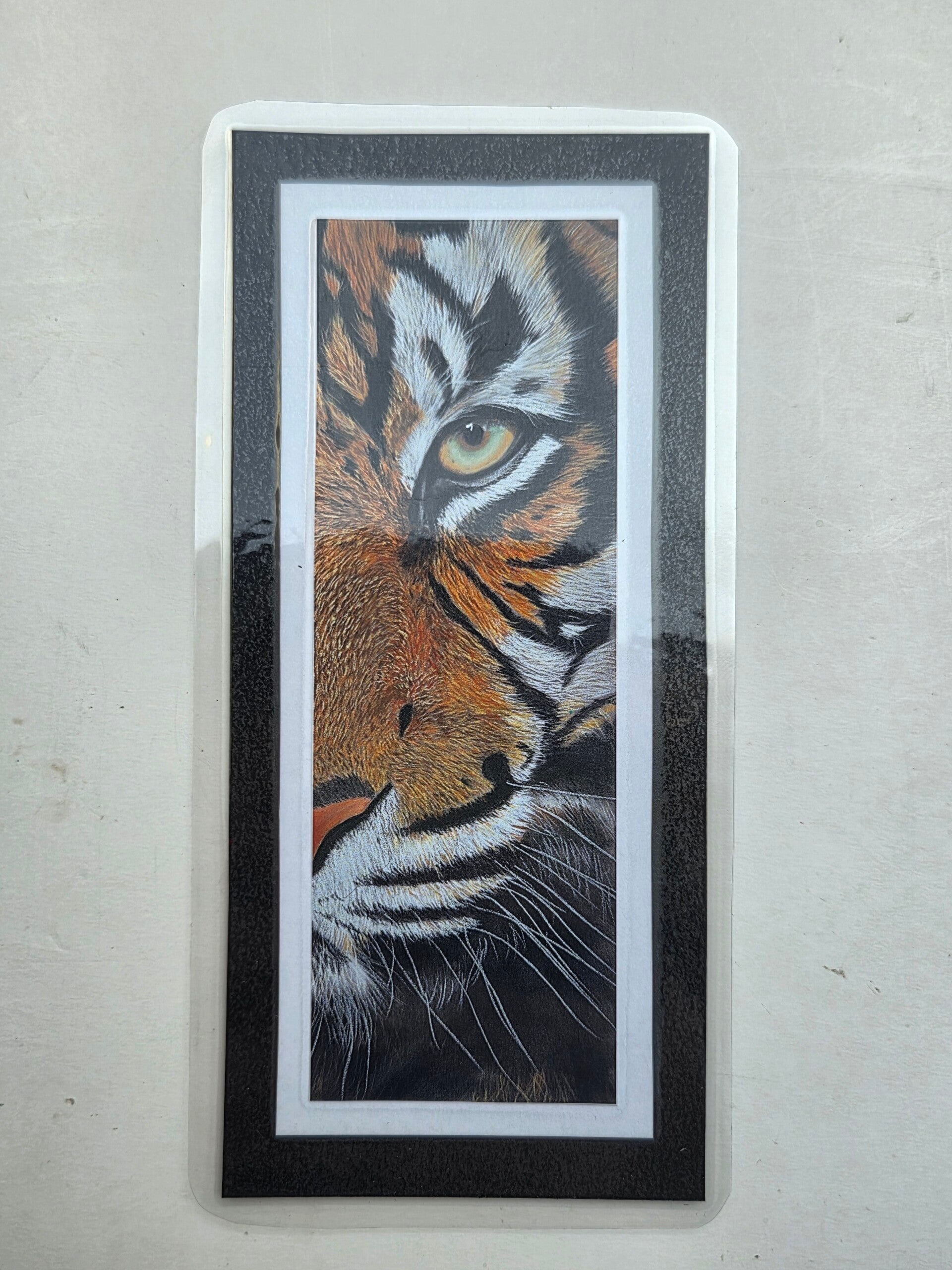 Papier photo de Tigre collé sur du papier blanc et noir et recouvert d'une feuille de plastique.