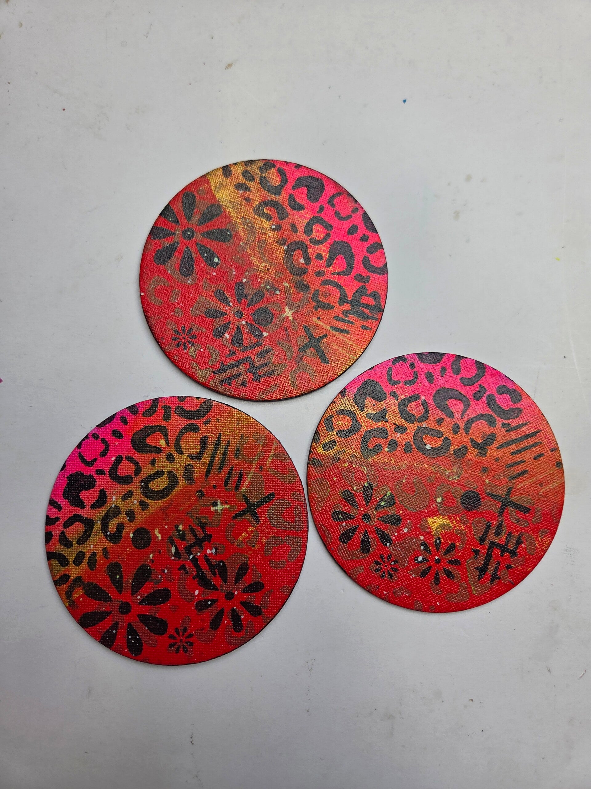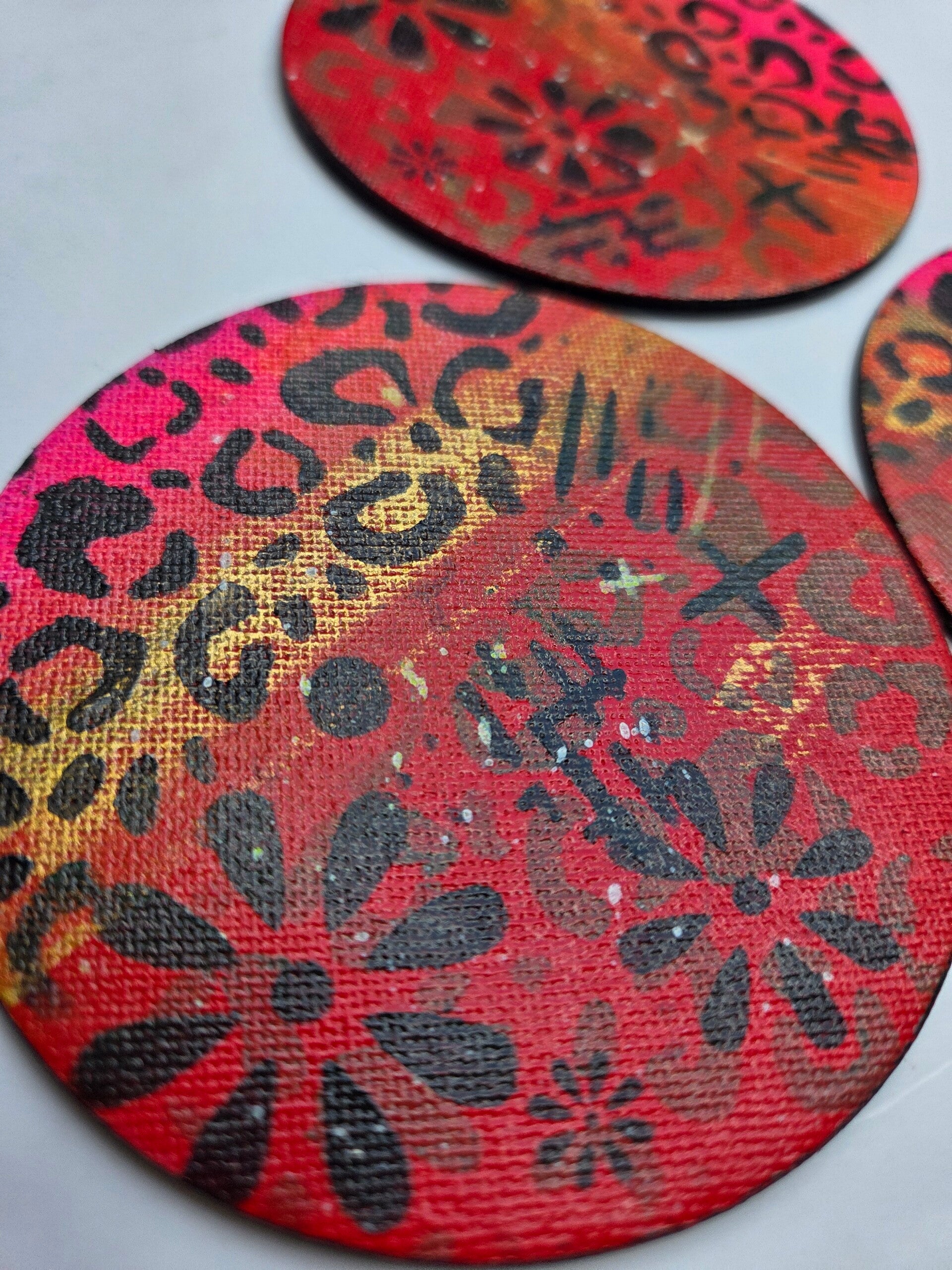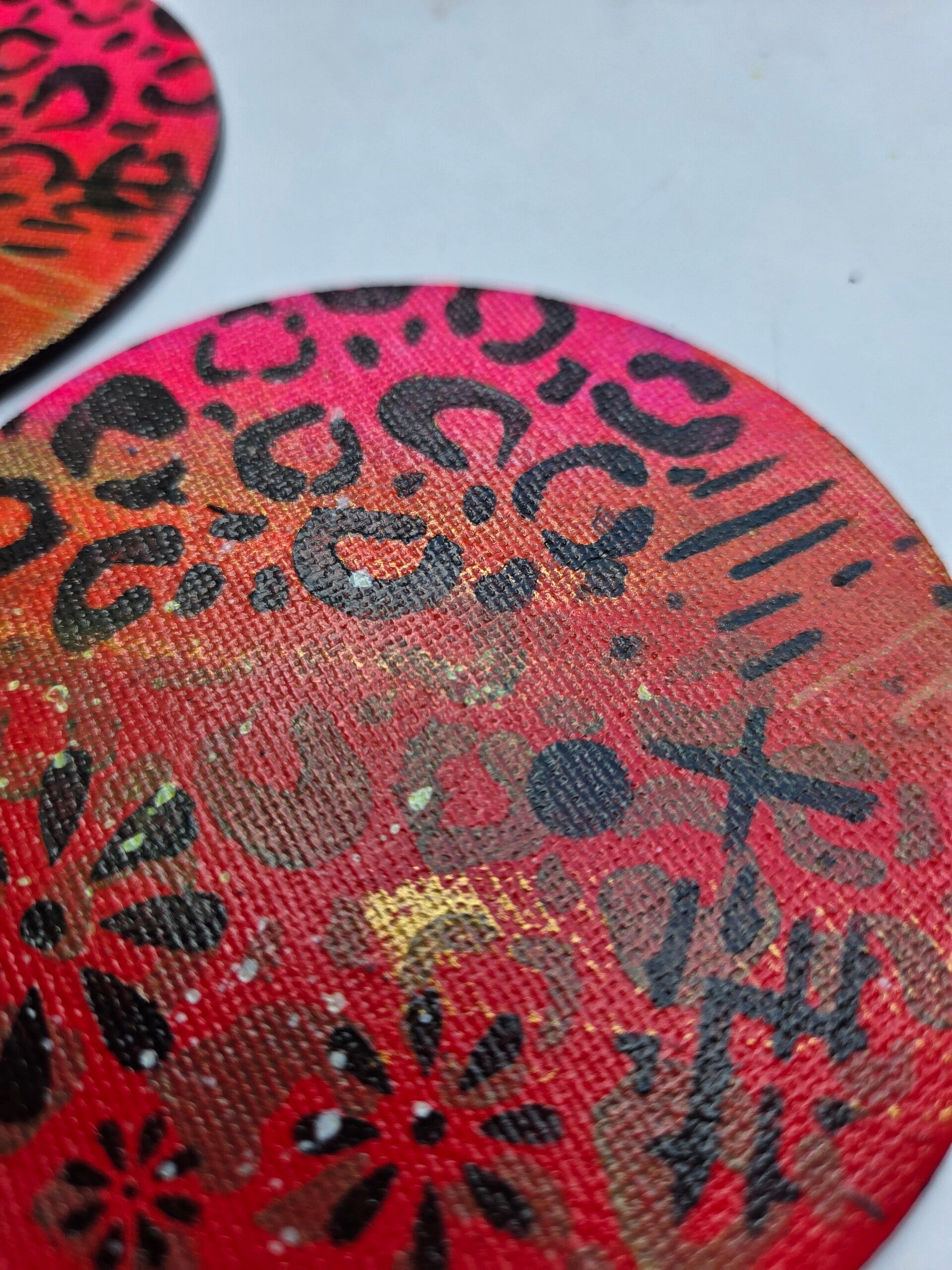 Aimant de frigo peint à la main, rond, dans les couleurs rouge et or. Mini œuvre signée au dos.