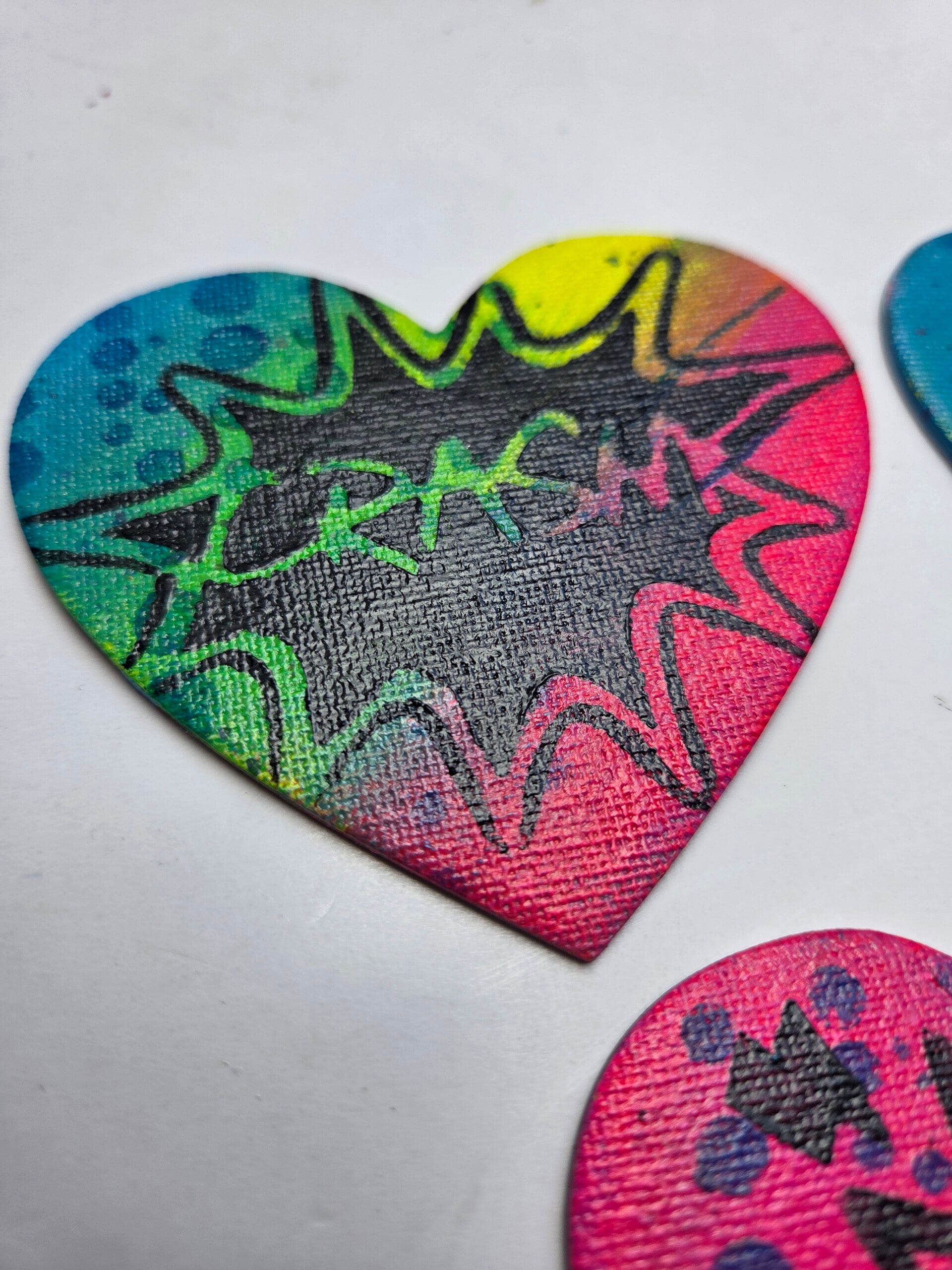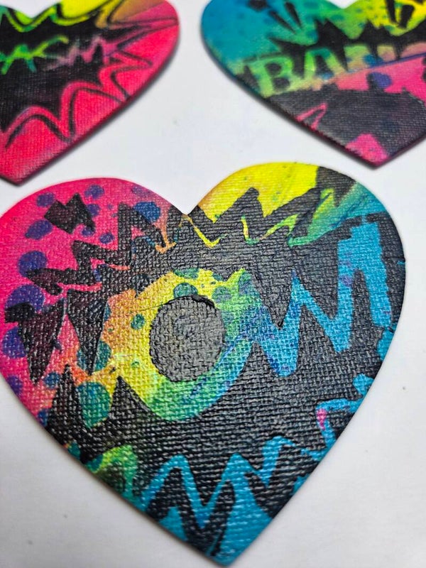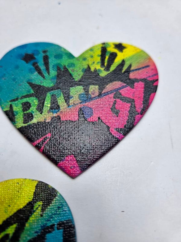 Aimant de frigo peint à la main, cœur dans les couleurs rose ,jaune bleu vert et noir . Mini œuvre signée au dos.