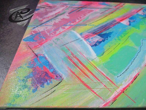 Médium : acrylique bleu, blanc, jaune fluo, rose, noir et Posca.